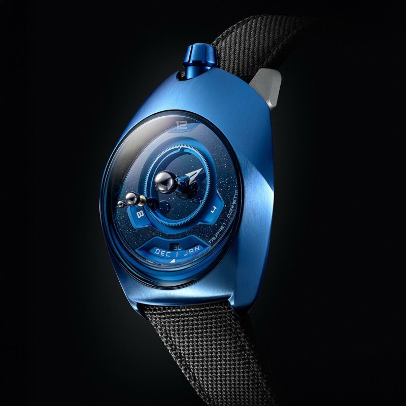 流麗かつ挑戦的なデザインで知られるエンジニア兼デザイナー、オリヴィエ・ガミエットが手がけた「SpaceOne Tellurium」は、まさに“近未来”そのもの。彼は昼はPeugeotのカーデザイナー、夜は時計デザイナーという二つの顔を持ち、2015年には独自の審美眼をまとめた著書『Soon - Timepiece Phenomena』も発表。その美意識が結実したのがこのタイムピースです。