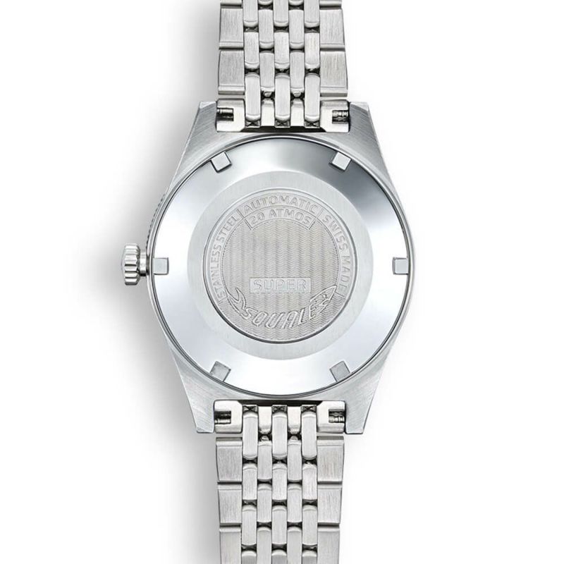 SUPER SQUALEは1960年代に発表され瞬く間にSQUALEコレクションの中で最も人気のあるデザインとなりました。スキンダイバーとして誕生したこのモデルは200m防水を保ちながら38mm径の小径にすることでダイビング中に可能な限り軽量になることを目的として設計されました。