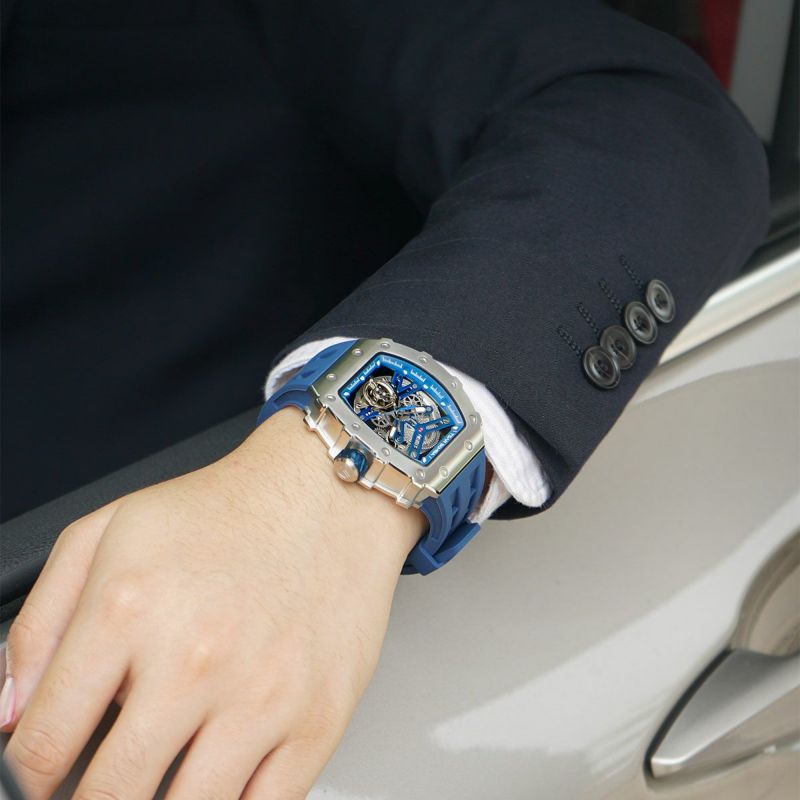 スケルトン仕様のダイヤルは、Tsar Bombaの内部機構を魅力的に映し出す窓です。精巧に組み込まれた歯車やブリッジ、バランスホイールを巧みに露出させることで、時計のエンジニアリングと芸術性の高さを存分に堪能いただけます。