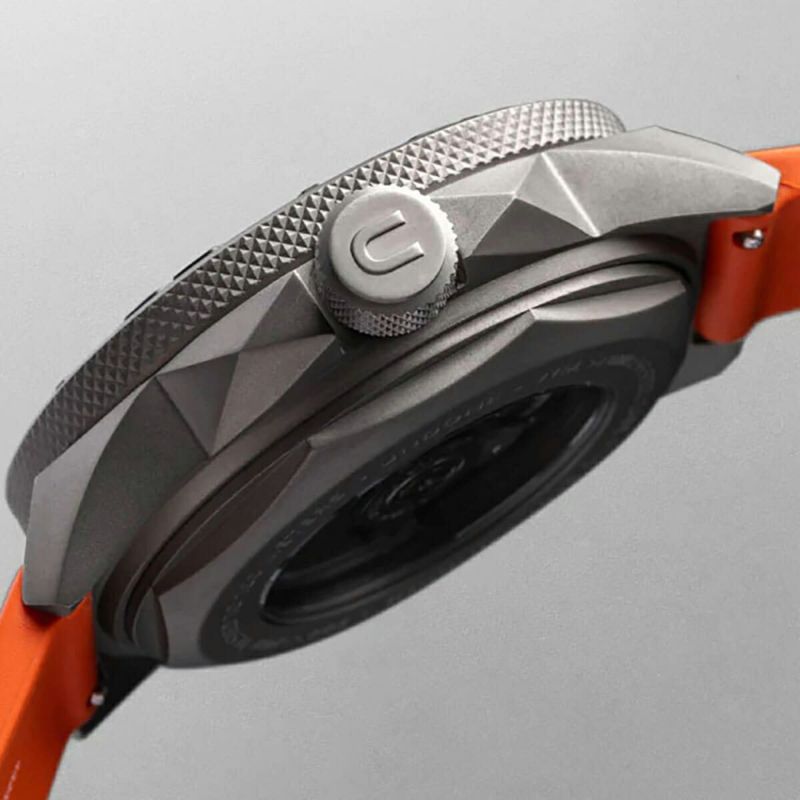 アクアディープは、サンドブラスト仕上げを施した「グレードII・チタンケース」に収められています。この素材は低アレルギー性で、海水や塩素などに対する高い耐食性を持ち、極端な温度でも安定性を保ちます。さらっとしたマットな質感と高い強度、何より軽量素材であるため、日常使いに最適なアイテムとなるはずです。