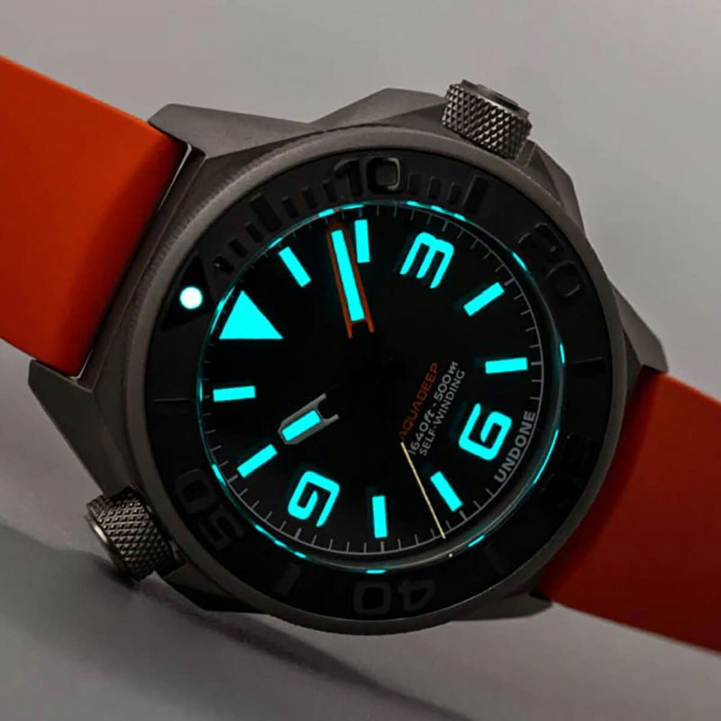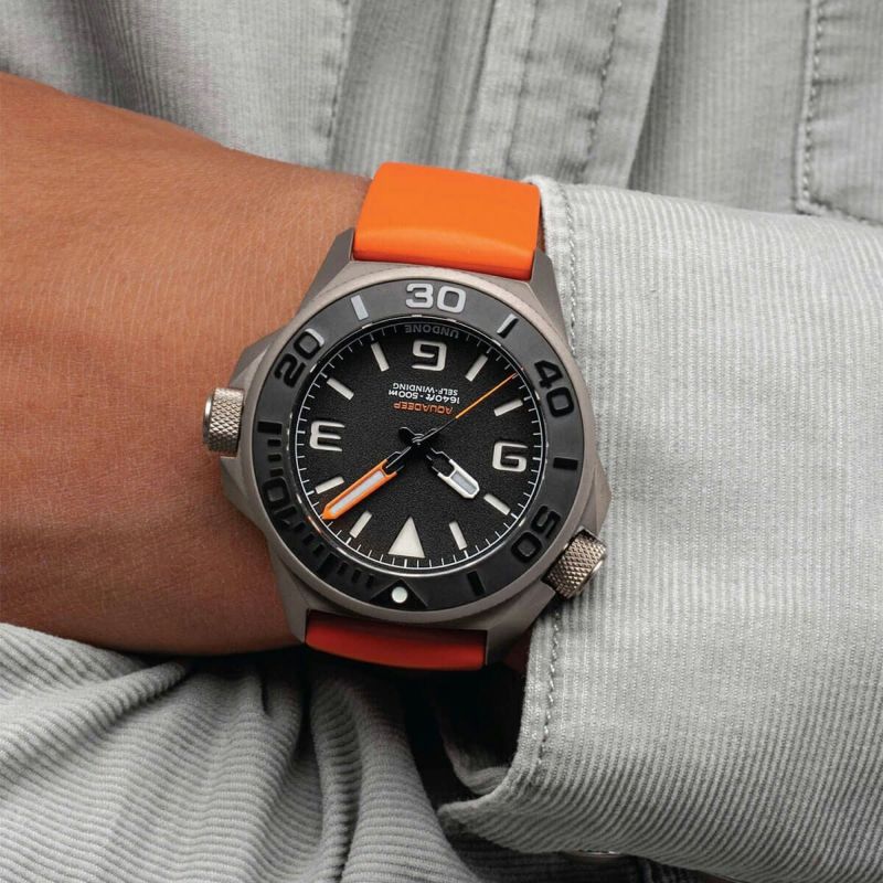 アクアディープは、サンドブラスト仕上げを施した「グレードII・チタンケース」に収められています。この素材は低アレルギー性で、海水や塩素などに対する高い耐食性を持ち、極端な温度でも安定性を保ちます。さらっとしたマットな質感と高い強度、何より軽量素材であるため、日常使いに最適なアイテムとなるはずです。