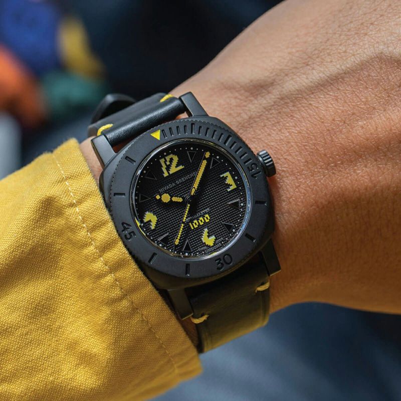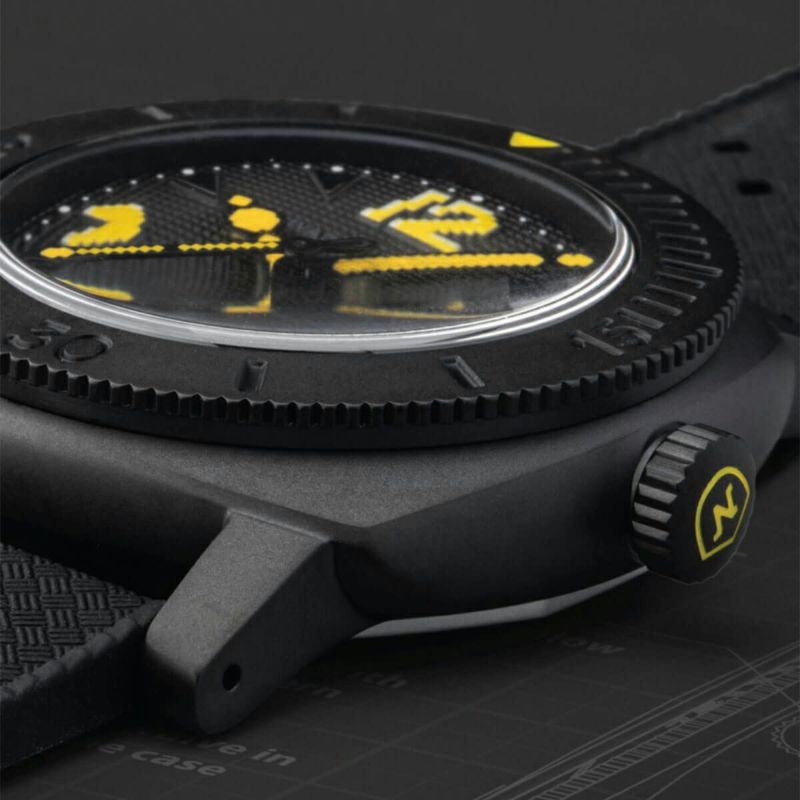 アーケードゲームのスクリーンにパックマンが映し出される様子にインスピレーションを受け、時計全体をブラックで統一し、インデックスには象徴的なビビッドなイエローを用いました。ダイアルに刻まれた防水性能を示す「1000」の文字は、ゲーム内でハイスコアを叩き出した感覚を思い出させるデザインに。
