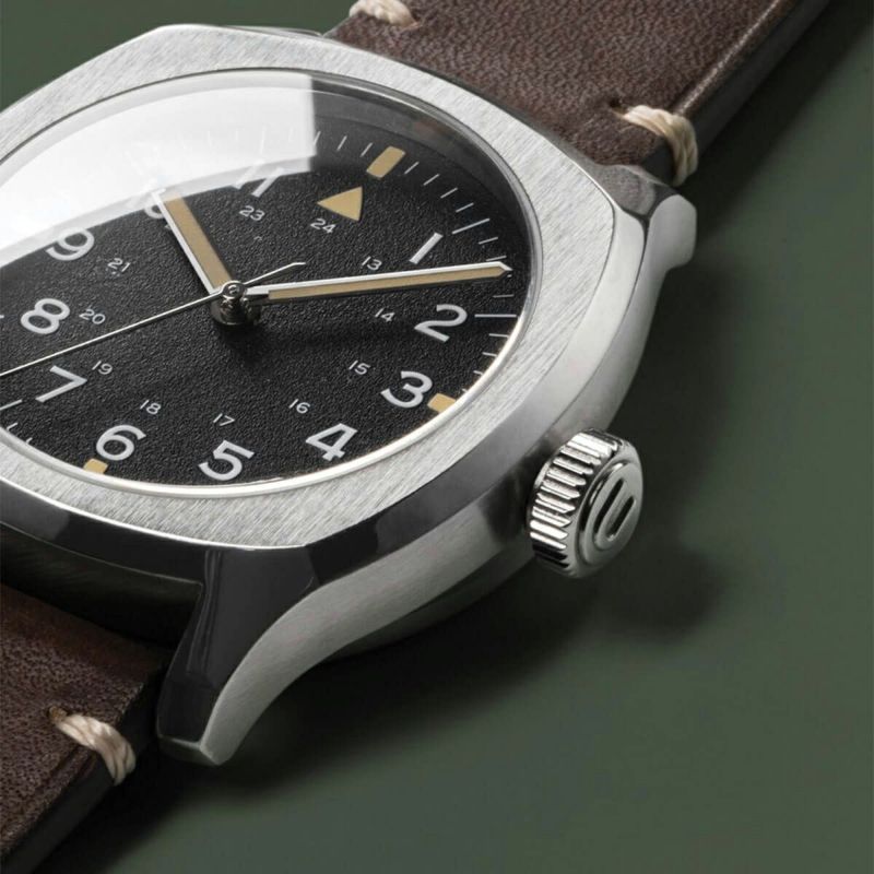 イタリア語で「亀」を意味する言葉、タルタルーガ。そう呼ばれるスクエアのクッションケースは、316Lステンレスを使用。腐食しにくく耐摩耗性に優れているこの素材は医療メスにも使用されています。前面をサンドブラスト加工、サイドを鏡面仕上げで加工しているので、よりクラシカルな雰囲気を楽しむことができます。