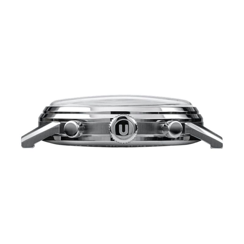 UNDONEの代表的コレクションに使われるVK61キャリバーシリーズは、縦に並んだサブダイアルが特徴。上側にはクロノグラフ分針、下側には時刻秒針が置かれています。中央秒針がクロノグラフ(ストップウォッチ機能)で、クォーツ式でありながら機械式を思わせるスイープ運進の秒針駆動を眺めることができます。