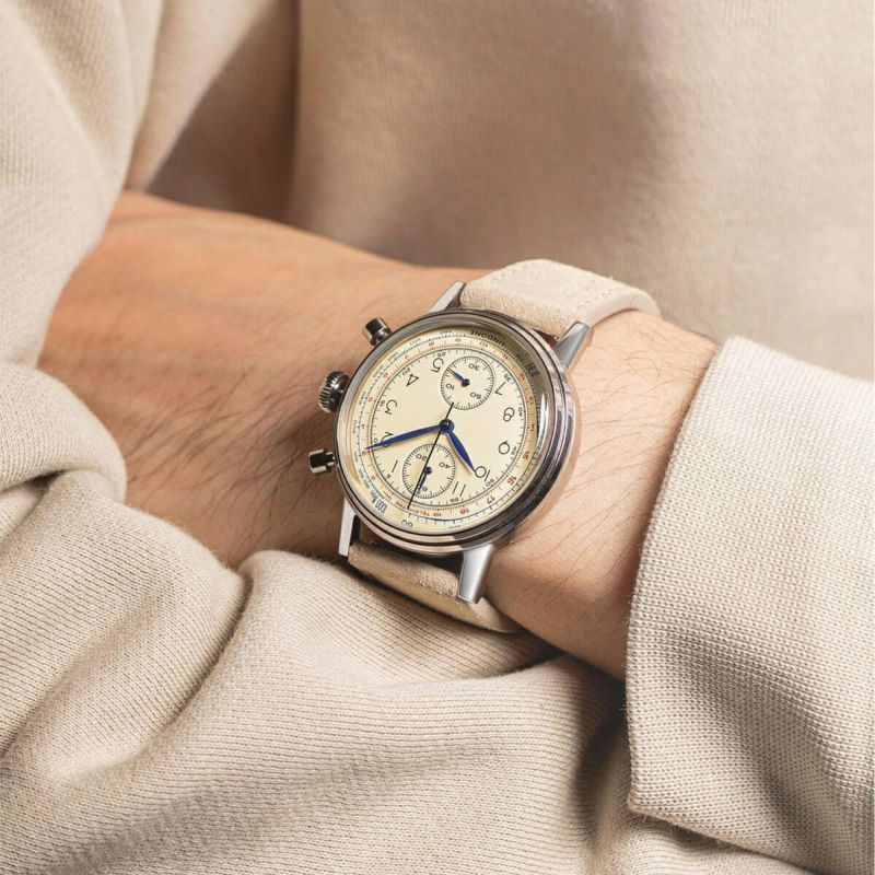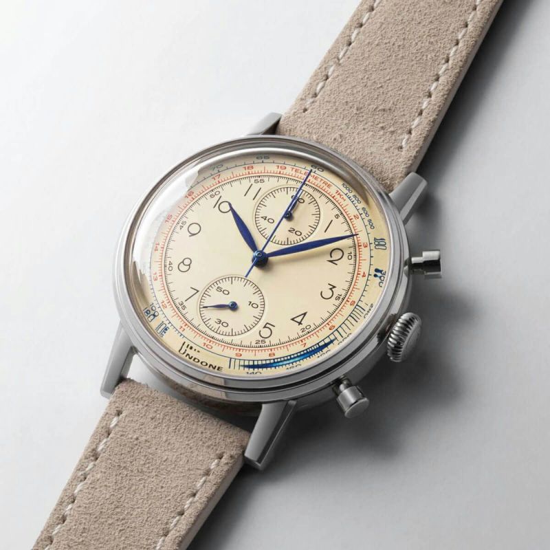 青のタキメーターは速度計で、クロノグラフ(ストップウォッチ機能)を利用して時速がわかります。一方で赤のテレメーターは距離計で、こちらもクロノグラフを使って対象物とのおおよその距離を測ることができます。レトロなデザイン性だけでなく、実際に使える機能として取り入れられています。