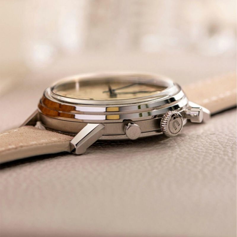 男女ともに使いやすい40mm径のケースサイズながら、ドーム型の強化ガラスで柔らかな印象を与えます。ケースには医療メスにも使われる316Lステンレスを採用しているので、耐摩耗性にも優れています。