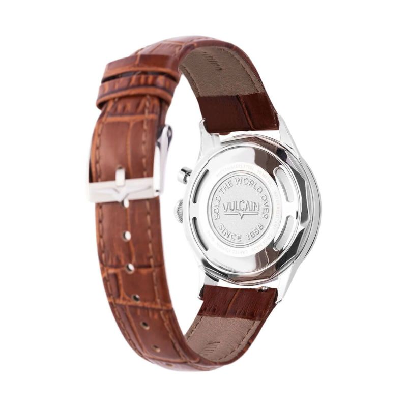 VULCAIN / ヴァルカン クリケット トラディション 36mm ステンレススティール ケース サファイア ケースバック セミマット ブラック ダイヤル ゴールド インデックス ブラウン カーフレザー イミテーション アリゲーター ストラップ スチール ピンバックル