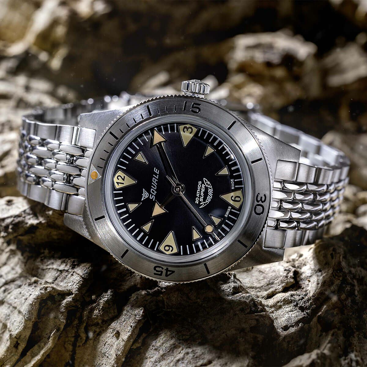 スイス・キアッソ発のダイバーズウォッチブランド「SQUALE(スクワーレ)」。 フランス語でサメを意味する同ブランドは1945年にスイス・ヌーシャテルでシャルル・フォン・ビューレン氏により、時計パーツのサプライヤーとして創立され、今では名だたるブランドのケース製造に携わってきた。やがて、ダイバーズウォッチに焦点を置き、オリジナルの時計を作り始めるようになる。そして世界で初めての1,000M防水時計を完成させた。 かの有名なダイバー、ジャック・マイヨール氏が1970年に伊豆半島沖が水深76mのフリーダイビングを成功させたときに使用していた時計もSQUALEだった。有名な時計ブランドのような華やかな歴史はないが、ダイバーズウォッチの質と基準を確立した代名詞となっている伝説のダイバーズウォッチブランド。現在のSQUALEは1970年代のデザインからインスピレーションを得ているものが多く、古き良きデザインを継承しつつ、ブランドのアイデンティティとも呼べる防水性、高品質な外装をしっかりと現代まで引き継いでいる。
