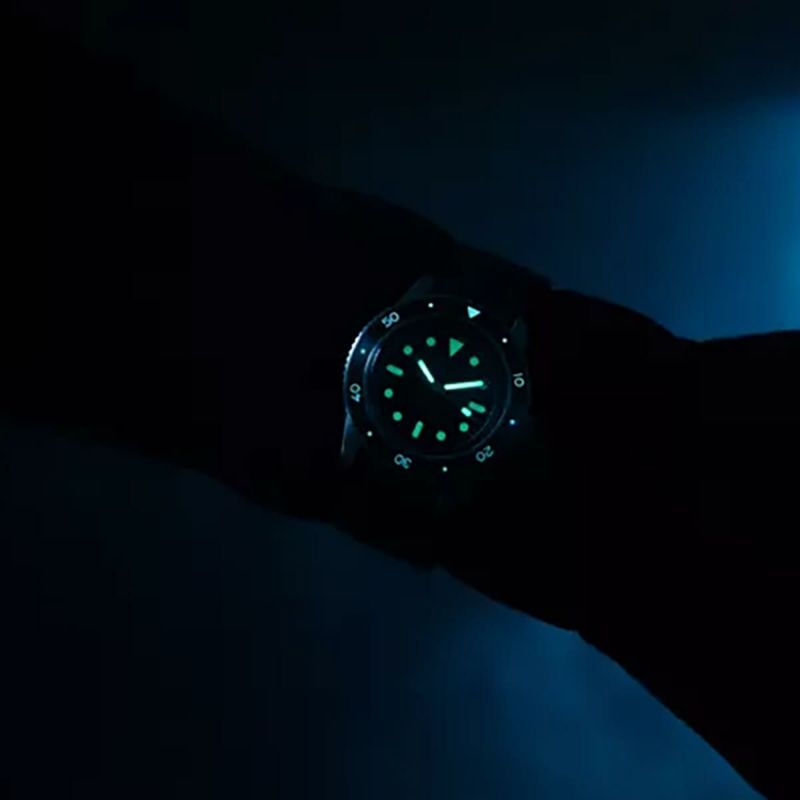 インデックスと針には、暗闇での視認性を高めるスーパールミノバBGW9夜光塗料が施されています。