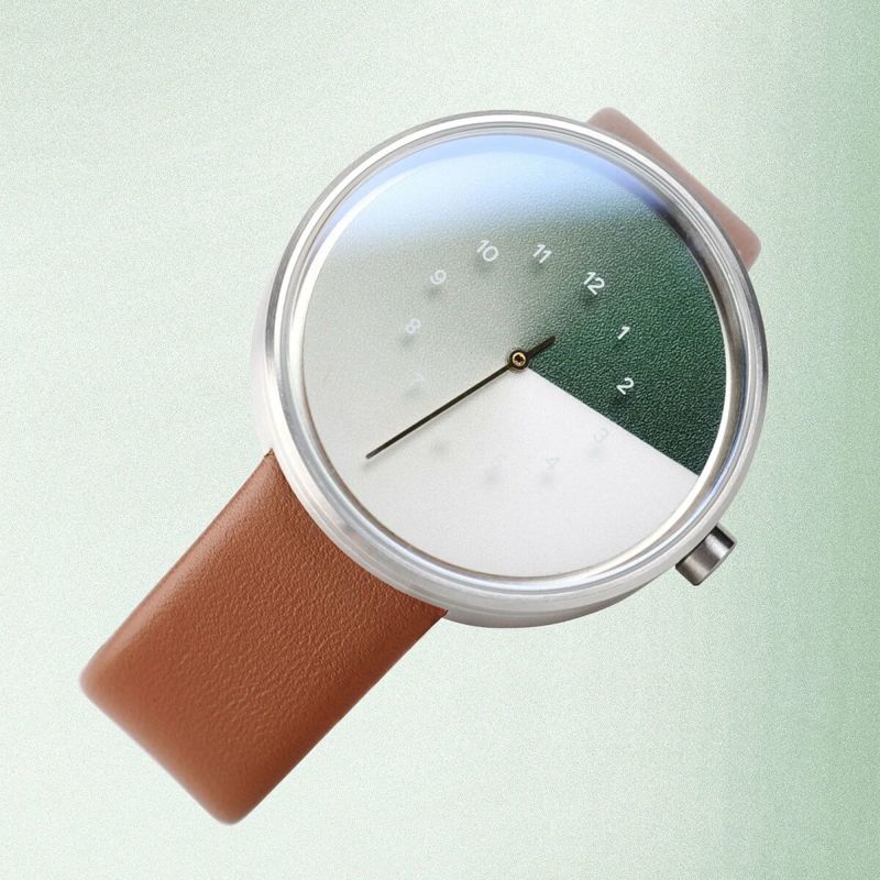 3つの異なるカラーバリエーションで提供されるこのデザイナーウォッチは、特徴的なグラデーションが際立っており、「白い時刻の数字がガラスの上に印刷された状態から徐々に現れていきます。デザインの暗い部分が時刻の下を通過するたびに、各時刻がその影の中から姿を現し、グラデーションが再び白に戻るとゆっくりと消えていく様子は、まさに芸術的な美しさです。