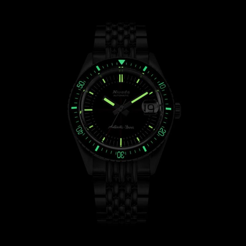 12時位置に伝説的な「ニバダ・オートマティック」のロゴ、そして6時位置にはヴィンテージ文字で「南極ダイバー」の文字が刻印されています。 ケースバックには、南極コレクションの象徴であるペンギンの横顔がエングレーヴィングされ、極寒の地を表したコレクション名にちなんでいます。