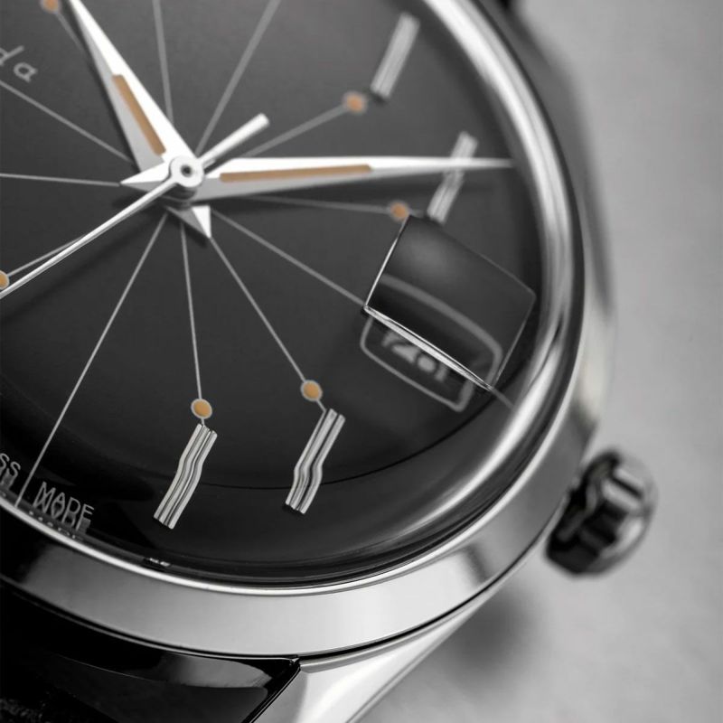 ダブルドーム型のサファイアクリスタルの下には、素晴らしいシルバーまたはブラックのダイヤルがあり、完全に織り込まれた8本の蜘蛛の脚が見えます。サンレイシルバーやブラックのダイヤルには縦に8つのインデックスが配置され、文字盤の中心に向かって収束する8本の線(蜘蛛の脚のように見えるため、時計の愛称となっています)によって接続されています。
