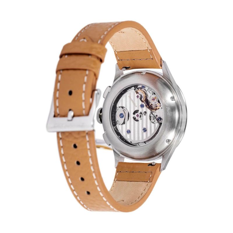 1866年にスイスのサン・ティミエ創業したクロノグラフ専門メーカーで数多くの有名ブランドにムーブメントを供給していたExelsior Park。クオーツショックの影響により一度幕を閉じた同ブランドが2020年に復活を遂げた。当時のいで立ちはそのままにインデックスをアプライト調にしダイヤルの散在感を強調、ケースサイズは39.8mmに抑えた小ぶりなクロノグラフを完成させた。 EP95004は、1950年代の時計製造のクラシックで、素晴らしく、非常に読みやすいブラシドサーモンの文字盤を特徴としています。ダブルドームのサファイアクリスタルで覆われ、防反射処理も施されています。手巻きのツインカウンタークロノグラフは、炎色仕上げの針が装備されています。スイス製のSellita SW510 BH Bムーブメントで動き、品質と永遠の象徴です。