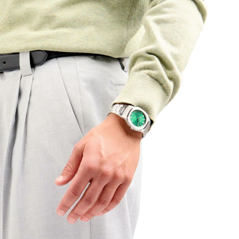 ロイヤルグリーンのサンレイ仕上げダイヤルが、クラシックさとモダンな美しさを絶妙に融合させています。。