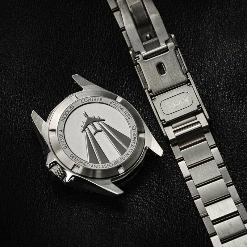 ボディには耐食性に優れた316Lステンレススチールを採用し、ノダス・ウォッチのチームが世界各地を飛び回り、NodeX のライセンス契約を獲得し、ワンタッチで容易に調整可能なクラスプが装備されており、さまざまな高度での体の変化に即座に対応することも出来る高いスペックも誇る。裏蓋にはトラベルウォッチを象徴する飛行機の模様刻印が施されている。