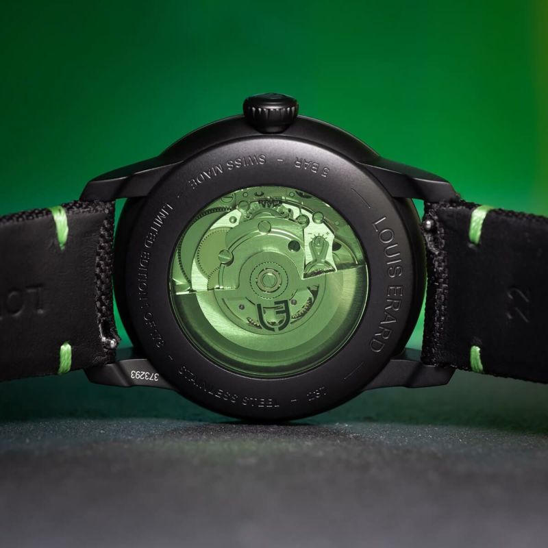 レギュレーターのテーマを新たに解釈したこの腕時計は、コラボレーションの真髄を捉えています。Louis Erard X Label Noir。ルイ・エラールは、フランシュ・モンターニュ地方で約100年にわたってマーベリックなブランドの1つでした。そして、Label Noirは10年以上にわたり、カスタマイズの最前線に立つジュネーブのアトリエでした。これら2つの世界が出会ったことで、緑色のスパークが生まれました。それは、太陽が地平線の後ろに隠れる前に地球に送り出す最後の光のような、鮮やかな緑色の輝きです。このスパークが、時計職人たちが生み出す深みのある黒の色合いを照らし出します。