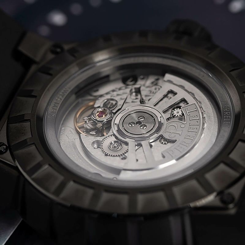 ペレレは、細部に至るまで綿密な注意を払っており、その姿勢は本当に驚くべきものです。外部クラウンは、フルーティングでデザインされたケースは、クラシックな時計製造のパターンを現代風にアレンジしたものです。正方形の溝が、純粋に建築的な柱を形成し、ケースの中央にも見られます。さらに、ケースの裏面をよく見ると、サファイアクリスタルを取り囲むリングにも同じ装飾的な溝があることに気づくでしょう。これらの細部には、未来的な優雅さによって動かされるタイムピースのエリートのサークルに属することを示唆するものがたくさんあります。