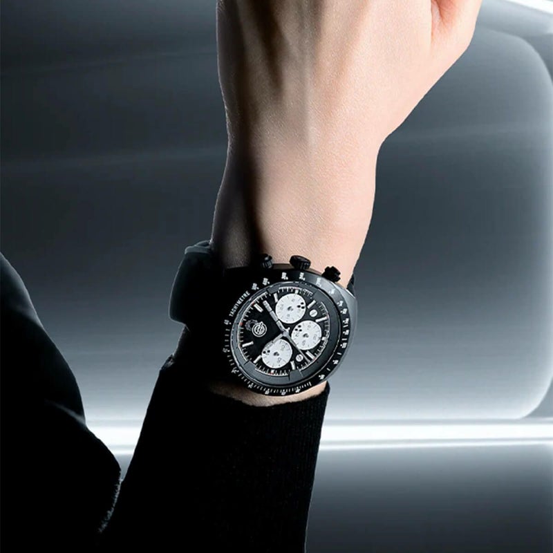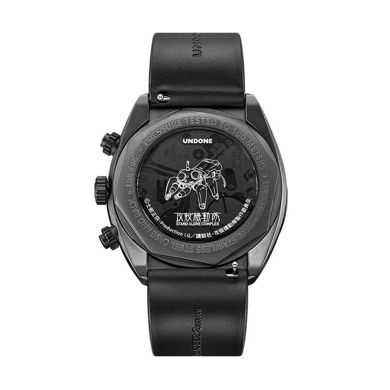 ケースは高級感のある、頑丈且つアレルギーを起こしにくい316Lステンレススチール製、IP加工をすることによってタチコマの外装を再現。タチコマの3つのアイボールがモチーフとなっているトリコンパックスダイヤルは、3時の位置から時計回りに24時間計、スモールセコンド(通常の秒針表示)、60分カウンターの順で配置されています。その他にも、タチコマのボディパーツをイメージした時分針や秒針やなど、随所にタチコマらしさを盛り込みました。 ムーブメントは日本製TMI VK63ハイブリッドを採用し、正確な時を刻みます。クロノグラフ(ストップウォッチ機能)も搭載、ラバー素材のストラップで、機能性にも優れたモデルです。サファイアクリスタルの下には、シリーズを象徴する「笑い男」マーク、更には闇で輝く蓄光の「公安九課」のマークがあり、攻殻機動隊が持つ革新性と哲学的なテーマを表現しています。裏蓋(ケースバック)には、精巧なタチコマの機体図と『STAND ALONE COMPLEX』公式エンブレムが刻まれており、普段『表には出ない』公安9課の機密性を演出します。