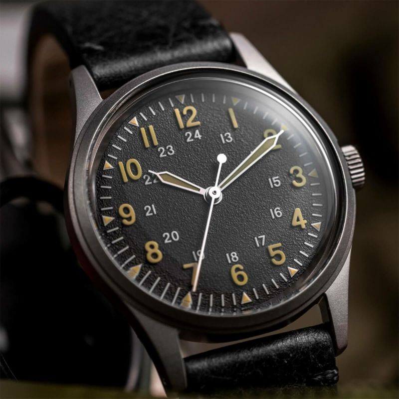 このGG-W-113のよりクリエイティブな解釈として、ポップコーンテクスチャのブラックダイヤルとパティナ加工されたインデックスを採用しました。34mmという小ぶりなケースサイズにもかかわらず、これらが組み合わさることで視認性が高まり、オリジナルデザインに独自性が加わっています。もともとGG-W-113の仕様では、光沢を抑えるために「パーカライズ」処理が求められていましたが、私たちはケース全体とケースバックに強力なサンドブラスト加工を施し、同様の効果を実現しました。