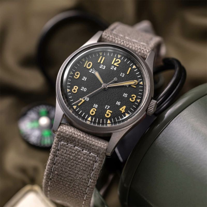 ジャングルフィールドは、1967年にアメリカ軍が発行したアイコニックなGG-W-113規格に着想を得て、視認性と信頼性を確保するためのすべての要素を取り入れています。オリジナルのGG-W-113規格は、ベトナム戦争中にアメリカのパイロットが使用した、非常に信頼性の高いツールとして広く知られています。この高性能な腕時計を提供するため、当時の仕様を可能な限り忠実に再現しました。