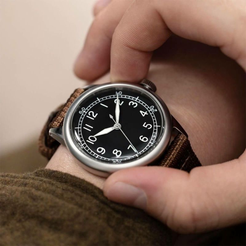 当初、A-11は基本的な手巻きのハッキング機能付きムーブメントを搭載していましたが、これらのムーブメントは時には信頼性に欠け、戦闘の厳しい環境では壊れやすいものでした。そこで、私たちはアリゾナ州を拠点とするFTS社の超精密で頑丈なアメリカ製クォーツムーブメント、Ameriquartz 6130をA-11 Specに採用しました。1940年代のオリジナルと同様に、A-11 Specもアメリカ製ムーブメントを搭載し、ペンシルベニア州にある自社組立ラインで組み立てられます。アメリカの時計製造が終わったなんて誰が言ったのでしょうか?