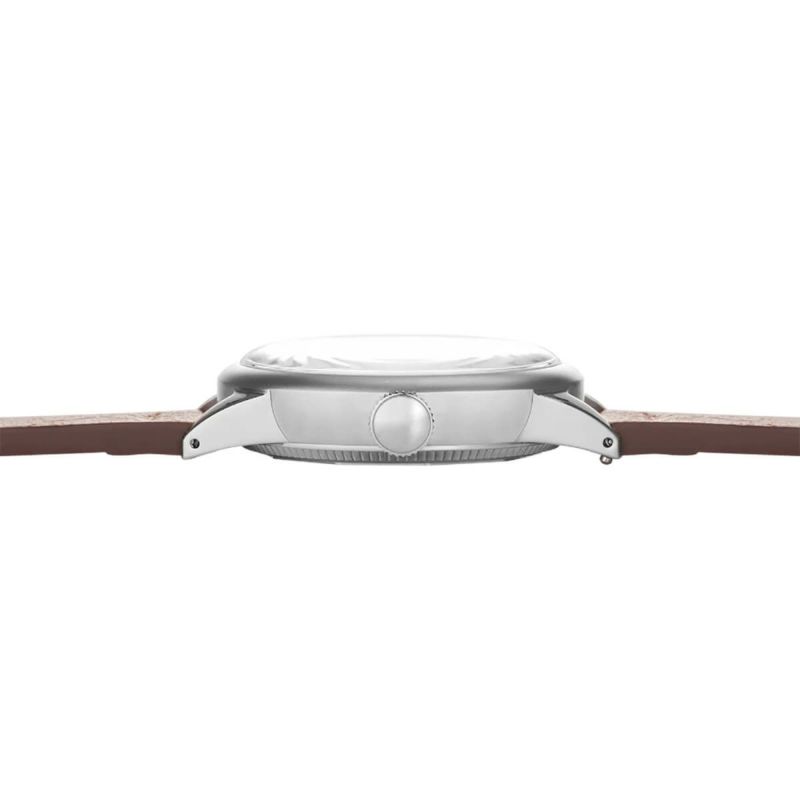 ブラウンレザーのストラップは、フィールドウォッチの美学に柔軟性を加え、時計全体をエレガントな解釈に仕上げています。このレザーストラップは、頑丈な装いにも、もう少し落ち着いた装いにも適しており、様々なシーンで活躍します。