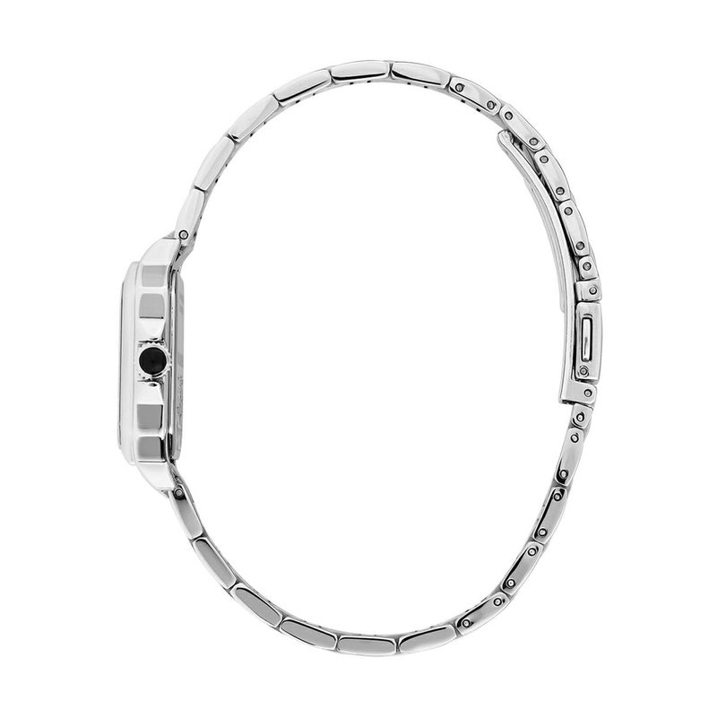 スクエア型のクリスタルベゼルが輝きを放つモデル。ブレスレット中央にはファセットカットのディテールを施し、クラウンにはブラックエナメルのカボションをセット。ダイヤルにはサンレイ加工やダイヤモンドダスト仕上げが施され、モダンなエレガンスを演出します。