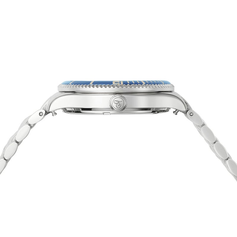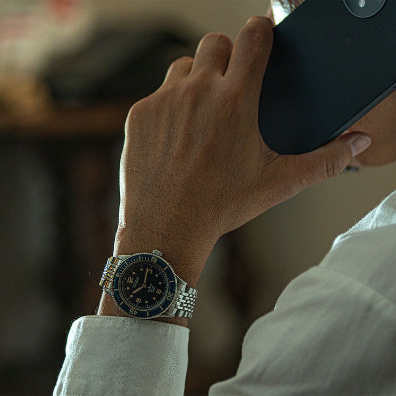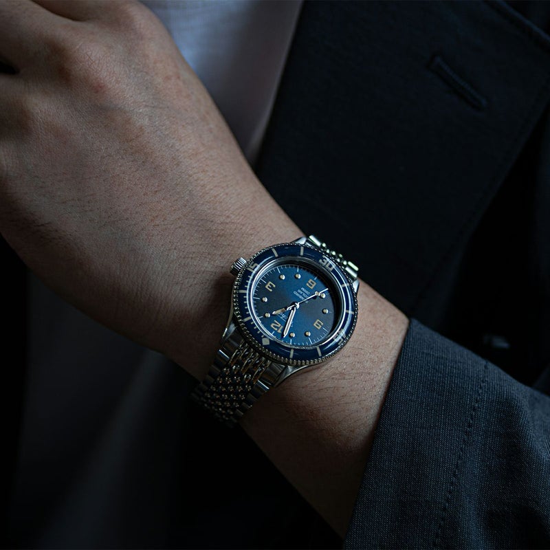 ブルーは黒と並ぶ定番カラーの一つですが、マリーンブルーのように深みのある色調は、着こなしの幅を一段上げてくれる存在です。カジュアルなシャツスタイルから、ネイビースーツの袖元まで、知的な抜け感を演出。オンとオフを行き来する大人にふさわしい、控えめで美しい“碧”のダイバーズです。