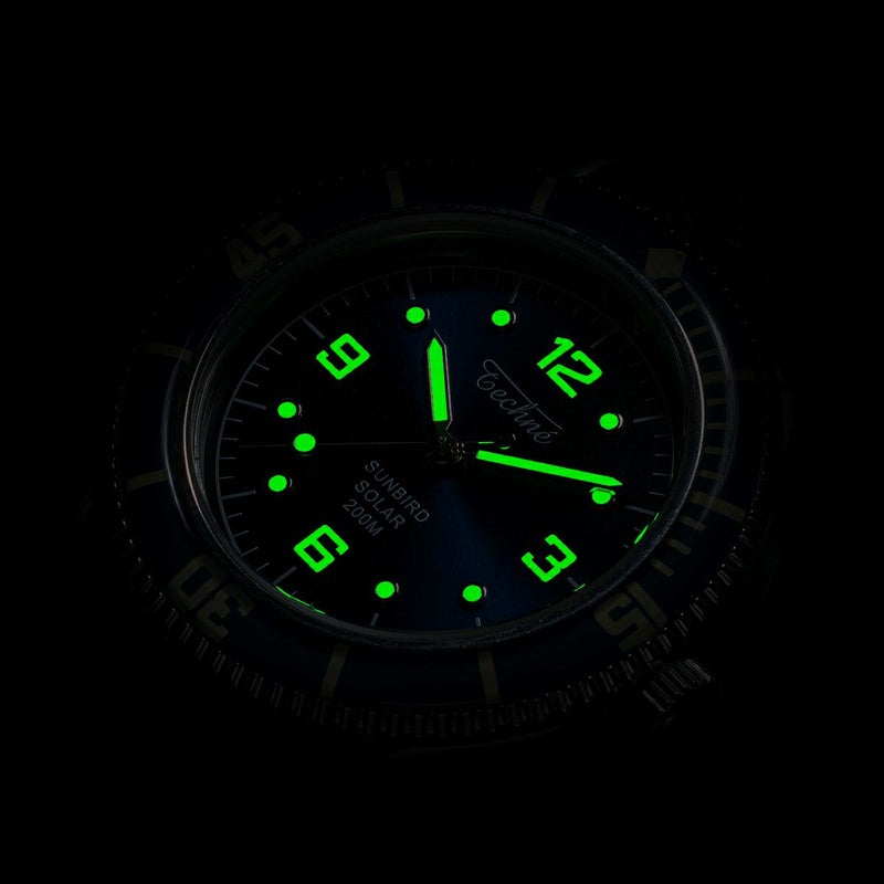 ガラスの淵から光を吸収するSUNBIRDソーラームーブメントに、200M防水のダイバーズ機能と反射防止サファイアガラスを搭載。強力な蓄光インデックスで視認性を高め、ステンレススチール316Lを使用。