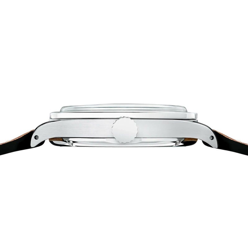 直径36mmのスチール製ケースには、縦方向にブラシ仕上げされたベゼルが付いており、円形ブラシ仕上げのラグ上部と質感の美しい相互作用を生み出しています。