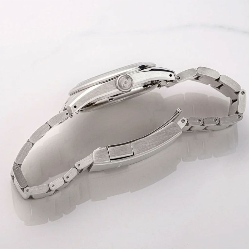 風防には、耐傷性に優れた ボックス型サファイアクリスタルを採用。ダイヤルと針をガラスに近づける構造により、視認性と立体感を高めつつ、効率的で洗練されたケースデザインを成立させています。