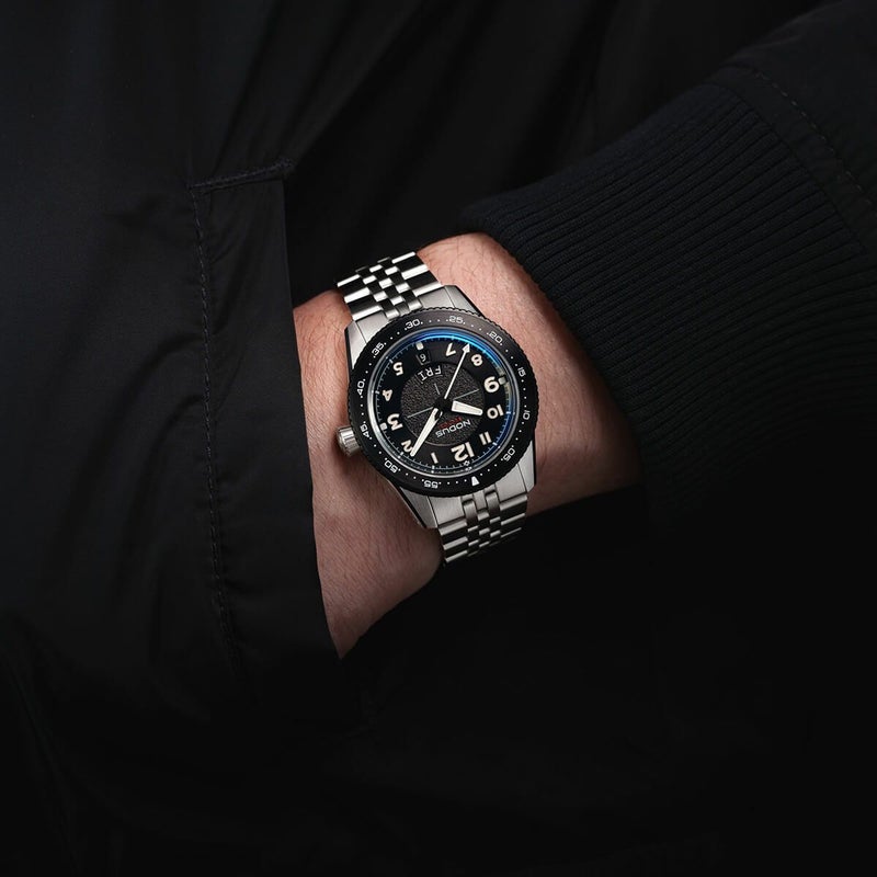 新たに生まれ変わったSector IIシリーズは、ケースとガラスが綿密に再設計され、厚さわずか11.7mmを実現しました。これは、Seiko NHムーブメントを採用したデザインの中でも最も薄型の一つでありながら、100m防水性能を維持しています。ケース形状とブレスレットエンドリンクも再デザインされ、手首に自然にフィットする流線型の形状を実現しました。
