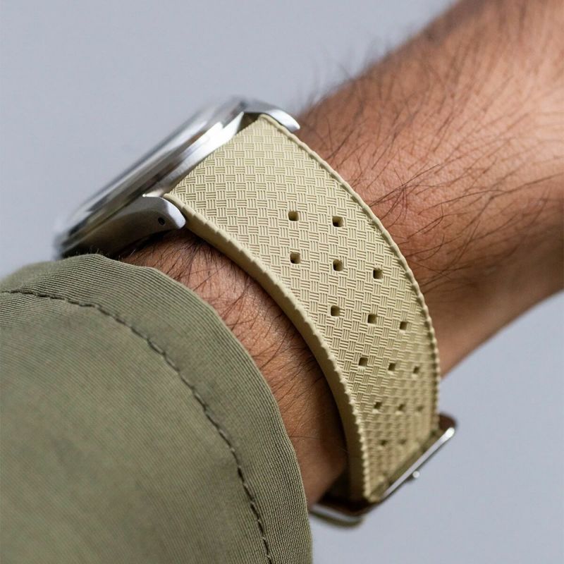 このトロピックストラップはクイックリリースシステムを搭載しており、5秒で腕時計に取り付けたり取り外したりすることができます。