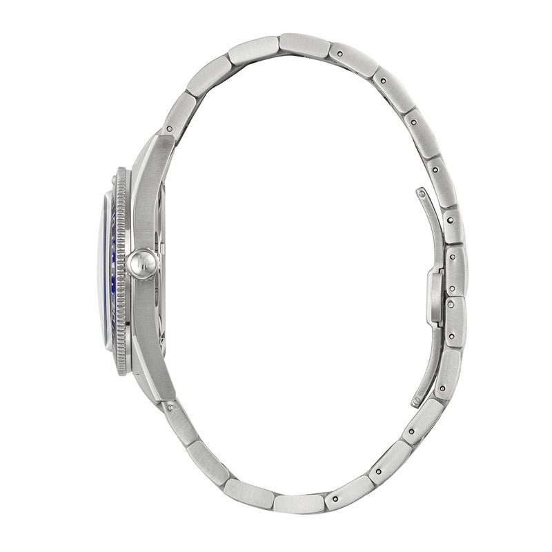 200メートル防水のダイバーズウォッチ「ノーティック 3」は、メカ・クォーツムーブメントを搭載し、日常使いに最適な精度と信頼性を兼ね備えています。1970年代のデザインに着想を得たこの時計は、大胆なレトロスタイルと汎用性で際立っており、都会でのシーンからスポーツやウォータースポーツまで、あらゆる場面にぴったりです。 39mmのブラッシュ仕上げを施したステンレス製ケースに、ダークブルーの文字盤、ブルーのアルミニウムベゼルがアクセントとなっています。