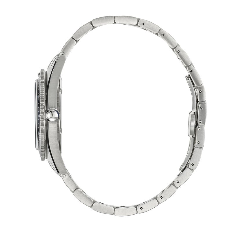 200メートル防水のこのダイバーズウォッチは、メカ・クォーツムーブメントを搭載。ヴィンテージ感あふれる「ノーティック 3」は、あらゆるシーンで堅牢さとスタイルを兼ね備え、毎日の生活に寄り添うようにデザインされています。 39mmのブラッシュ仕上げを施したステンレス製ケースには、視認性の高いオーシャンブルーの文字盤が収められ、反射防止加工を施したサファイアクリスタルによって保護。針とインデックスには、スーパールミノバが塗布されています。