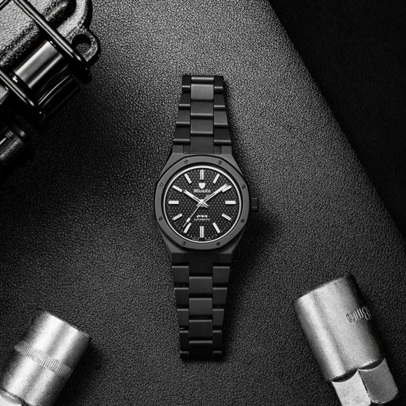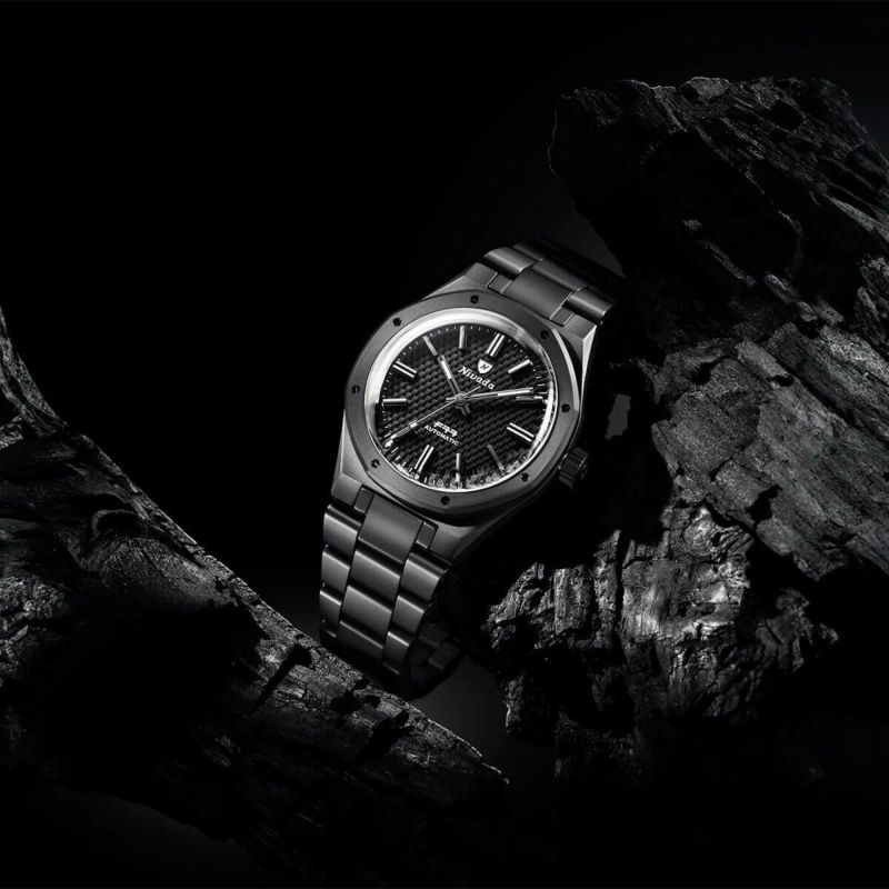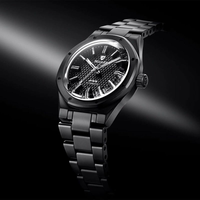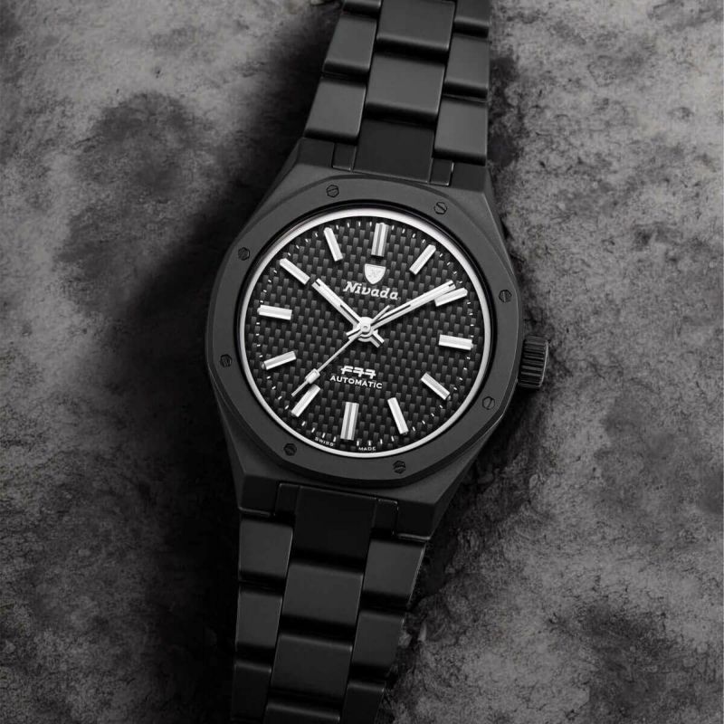 F77 Black Ceramicは、カーボンスタイルのブラックブレイデッドダイヤルを備えた、ヴィンテージデザインへの現代的なオマージュです。クラシックな時計の精緻な質感にインスパイアされた編み込み模様のダイヤルは、カーボンファイバーを思わせる洗練された男性的な美学を作り出しています。