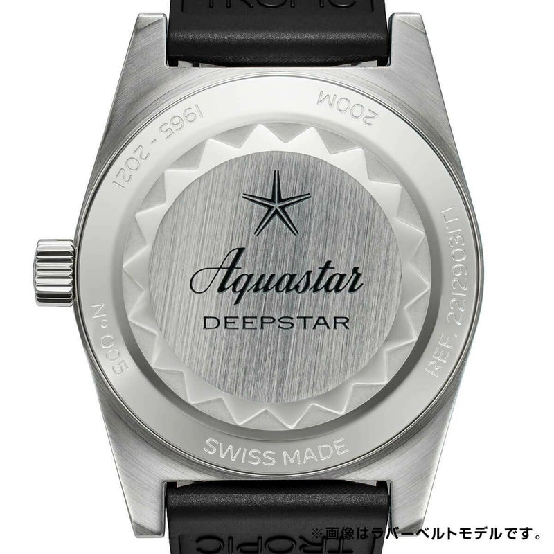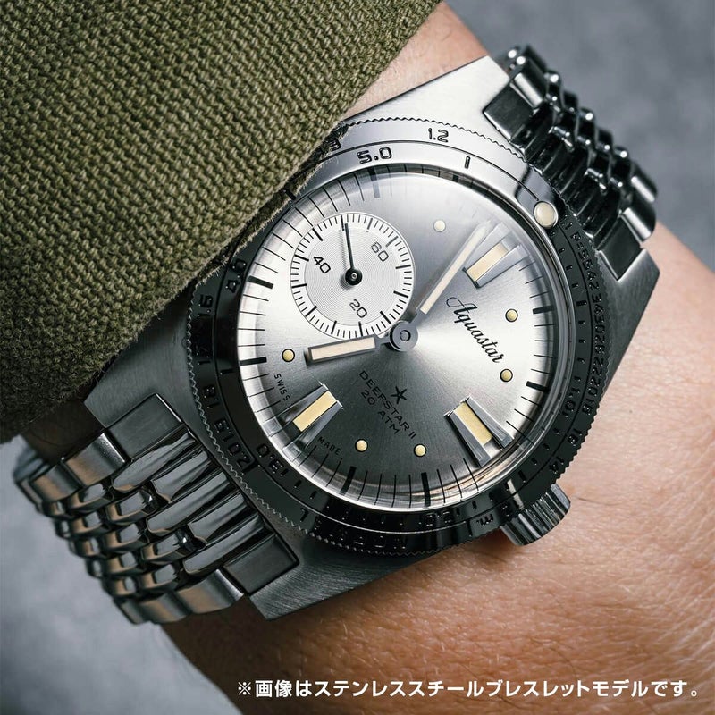 アクアスター・ディープスターIIは、1963年に発売されたオリジナルのディープスターを進化させたモデルで、ノンクロノグラフ、使いやすい3針機構、37mmX46mmの適度な大きさで着け心地が良く、複数の潜水時間と減圧時間を計算できるオリジナルと同じ特許を使用しているのが特徴です。 60年代に最も影響力のあったダイバーズウォッチを再現したもので、ユニークですっきりしたモノサブダイヤル、特許取得の多重潜水減圧ベゼル表など、一目でわかるデザインで、比類なきダイバーズツールとなりました。 このモデルは、ケースバックにシリアルナンバーが刻印されています。 新しいDeepstar IIは、装着性に優れた37mmのステンレススチールケースに、1962年に発売されたDeepstar Chronographの機能優先の理念とプロポーション、そしてアクアスターの2つの重要なアイデンティティを保持しています:回転タイミングベゼルには、繰り返し潜水の時間を計測するためのブランド独自の「無減圧」テーブル(この種のものとしては最初で唯一)が付いています。また、アクアスターの創業者であり革新者でもあるフレデリック・ロバートが考案した、象徴的な「サイクロプス」スタイルのモノコンパックスカウンターも備えています。Deepstar IIでは、このディテールに加え、9時位置のランニング・セコンド・レジスタが搭載されています。Deepstar Chronographと同様、Deepstar IIは200m防水を備え、スイス製の最高級自動巻きムーブメントが搭載されています。