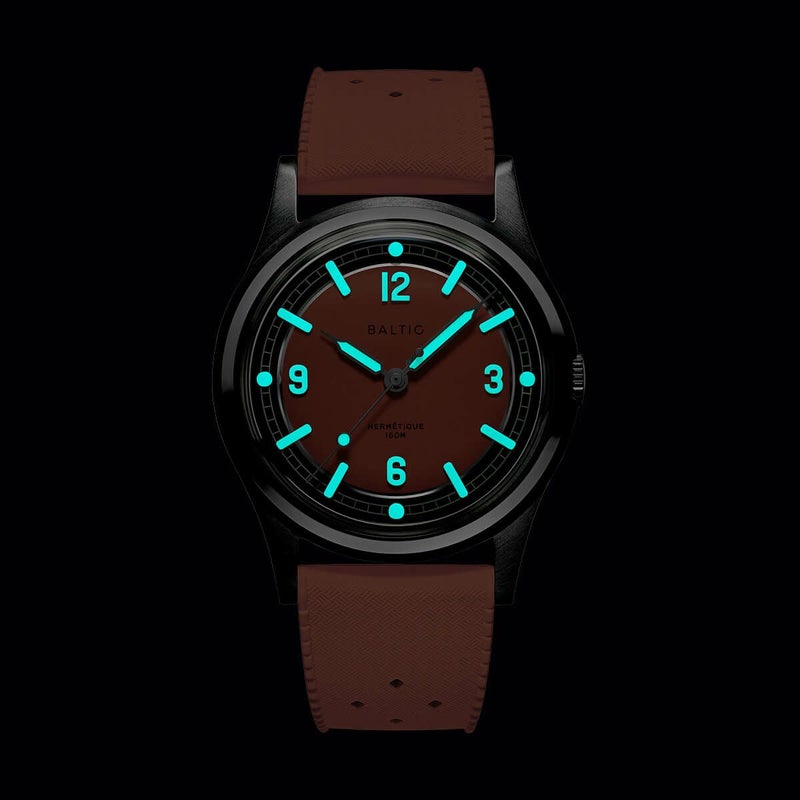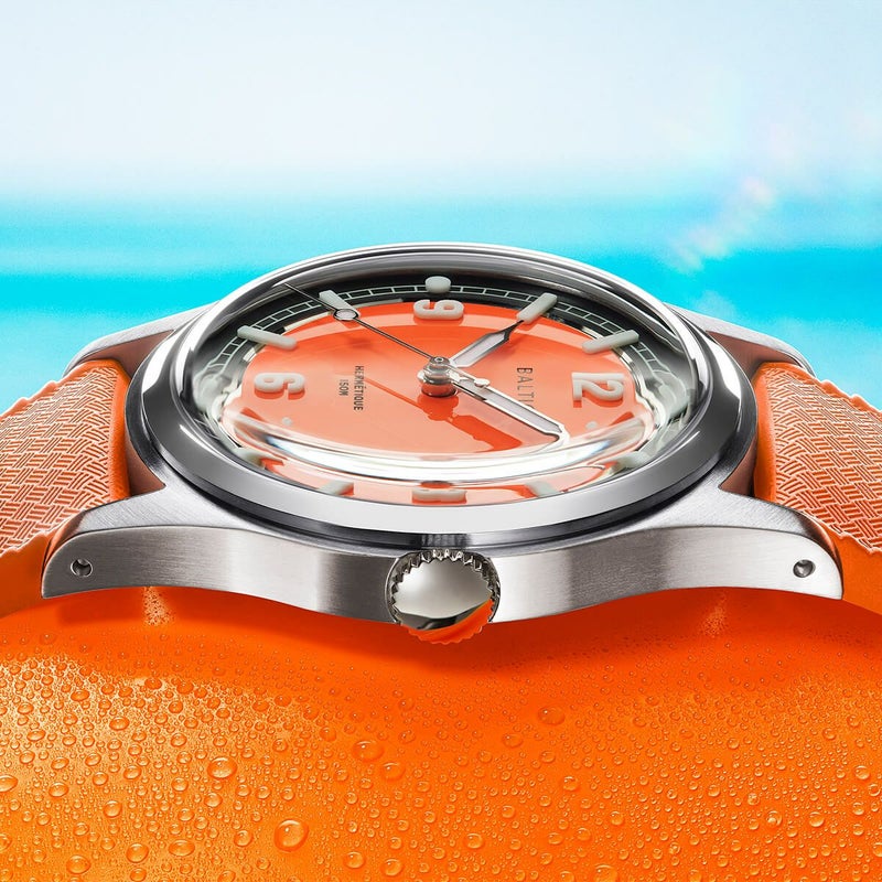 Hermetique Summerは、薄くて軽く、どんなシーンでも“着けていることを忘れる”ほど快適な万能ツールウォッチ。直径37mmのケースは316Lステンレススチール製で、ダブルドーム型のサファイアクリスタルを採用。最大150mの防水性能を備え、日常はもちろんアウトドアでも信頼できる耐久性を誇ります。