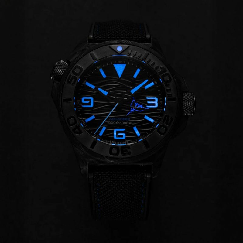 文字盤には波をモチーフにした模様があしらわれ、UVライトを当てると、隠されたマンタのシルエットが浮かび上がります。