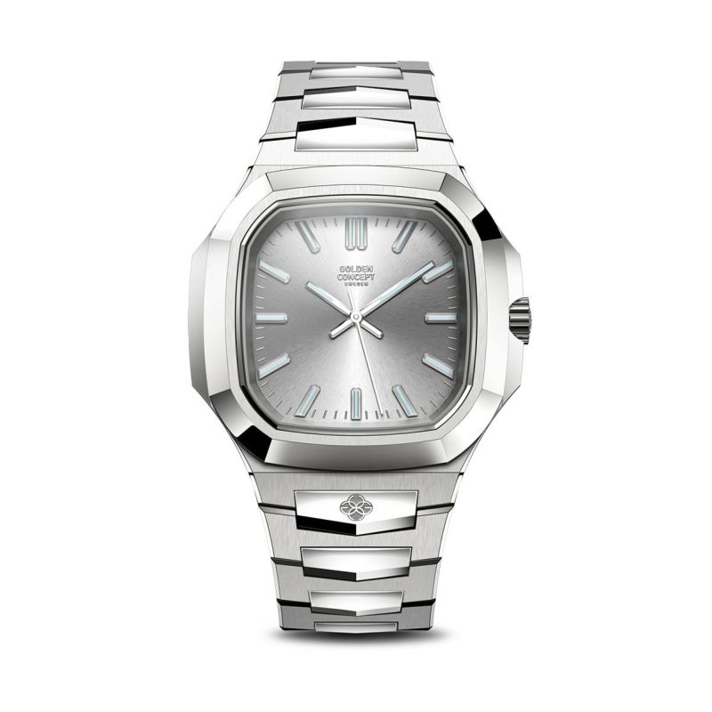 GOLDEN CONCEPT Royal Evening Glacier Silverは、透明感のあるライトグレーダイヤルが静かな輝きを放つ、スイス製自動巻ラグジュアリースポーツウォッチです。