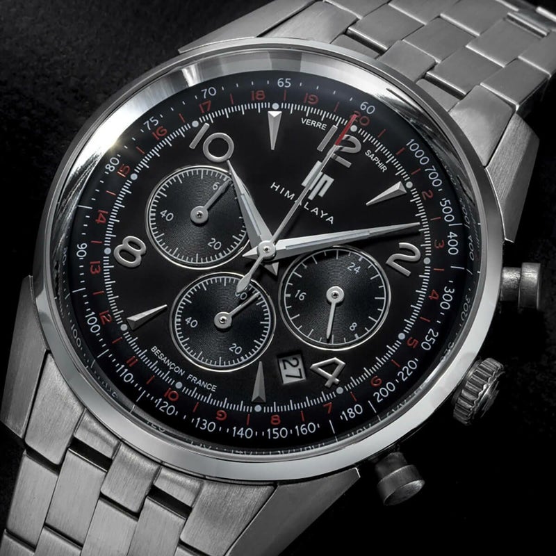 LIP Himalaya Chronograph ブラックダイヤルとステンレスブレスが際立つ、スポーティでエレガントなタイムピース。