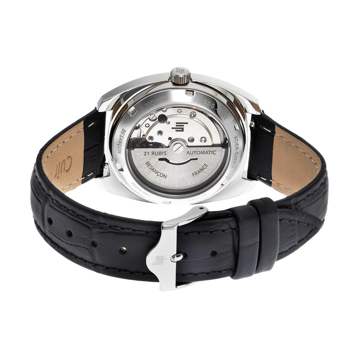 フランスの時計技術と美意識を象徴するこの一本は、自動巻きムーブメントを搭載し、スクリューバック仕様のシースルーケースバックから精緻なメカニズムを覗くことができます。