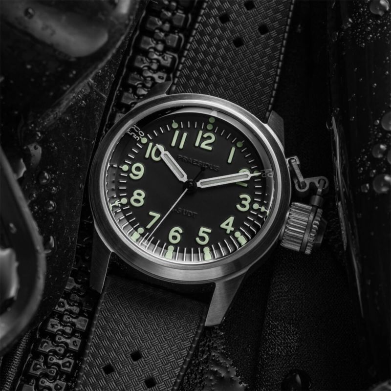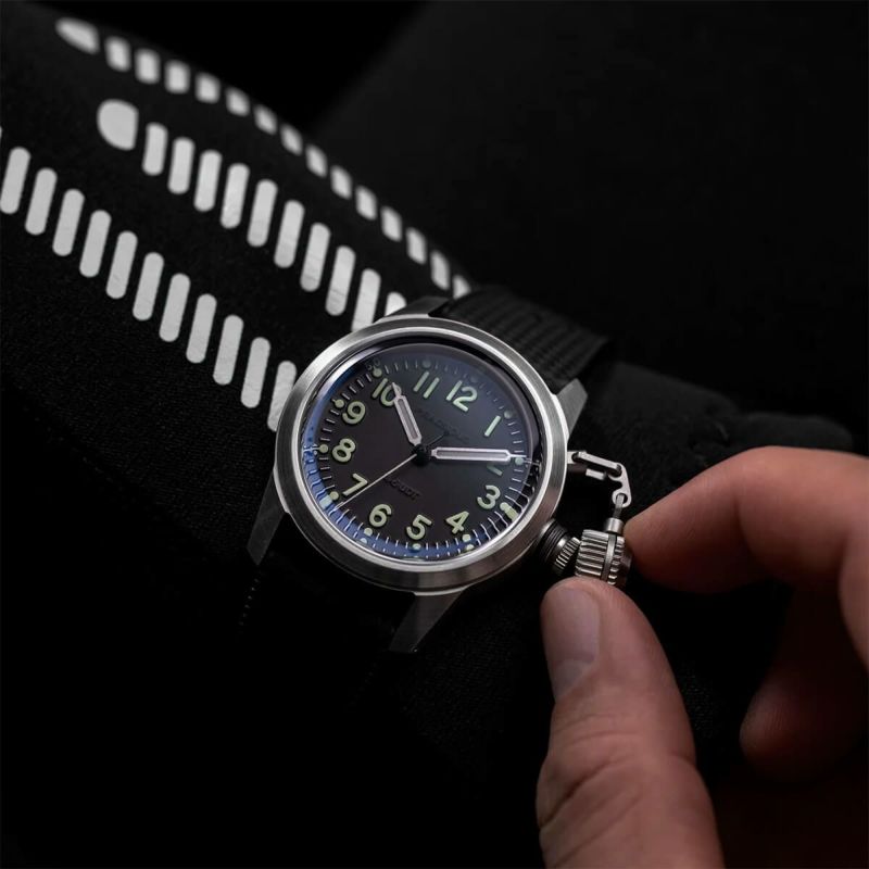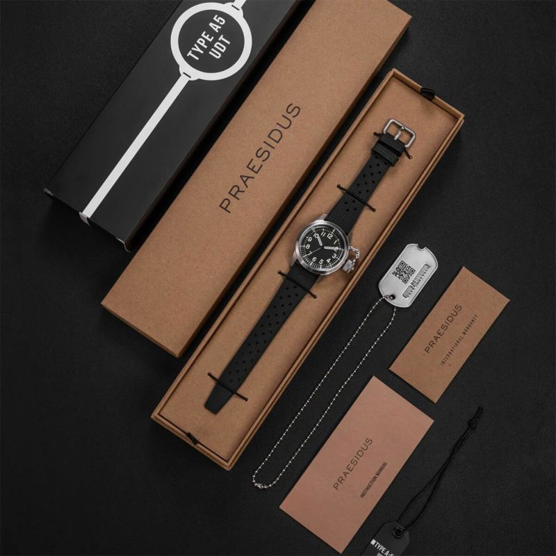 A-5 UDTは、人類が潜水できるようになって以来求められてきた、信頼性の高い水中での時刻管理を実現するために設計されました。オリジナルの米海軍BUSHIPSデザインに基づいたこのダイバーズウォッチは、オーバーサイズのクラウンと頑丈なケースで、その堅牢さを誇示しています。第二次世界大戦中、このシステムは、潜水破壊チームが長時間のダイビングミッション中に時計の防水性を確保する唯一の方法でした。これは単なるオマージュではなく、このアイコンを真に復活させたものです。