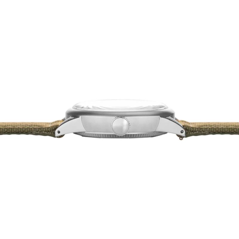 ドレブグリーンのキャンバスストラップは、時計全体をフィールドウォッチの領域にしっかりと位置付けています。このストラップは厚く頑丈に作られており、米軍兵士がフィールドで同様のストラップを選んだ理由も納得できます。