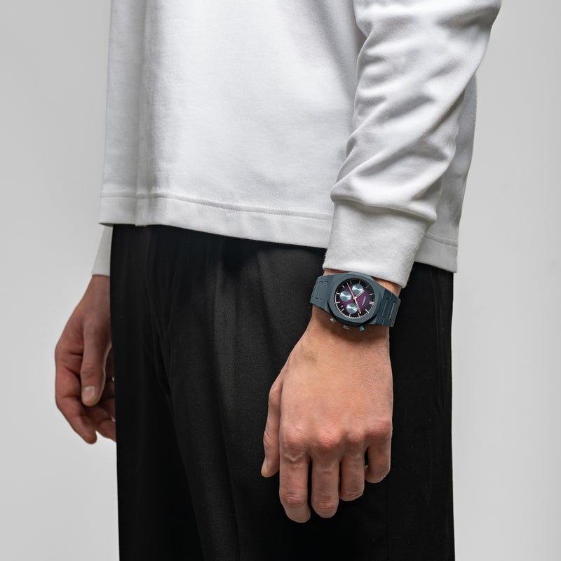 マットなケースが色のコントラストを際立たせ、手元に内なるヒーローの気分を呼び起こします。光で濃淡がゆっくり移ろうディープブルーのグラデーションが奥行きを生み、プッシュボタンなど細部にもカラーを引き立てるアクセントを配置。軽量な着け心地のまま、色で遊べるコレクションです。