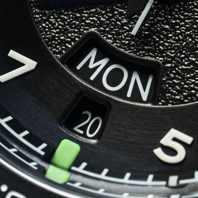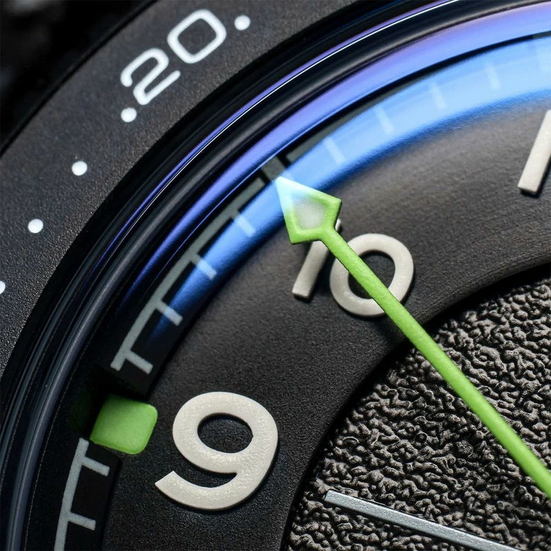 ダイヤルには、航空機の計器類から着想を得たネオングリーンのアクセントを採用。低照度環境でも高い視認性を確保する色調で、パイロットウォッチとしての機能性を強く意識した配色です。フロスト仕上げのアプライドインデックスにはSuper-LumiNovaを充填し、昼夜を問わず確実な判読性を提供します。