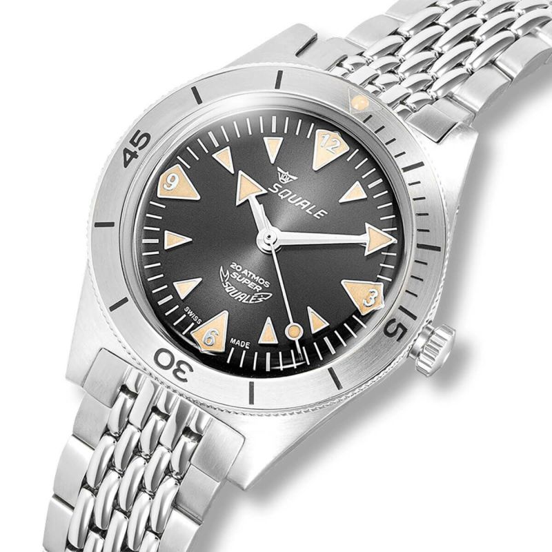 スイス・キアッソ発のダイバーズウォッチブランド「SQUALE(スクワーレ)」。 フランス語でサメを意味する同ブランドは1945年にスイス・ヌーシャテルでシャルル・フォン・ビューレン氏により、時計パーツのサプライヤーとして創立され、今では名だたるブランドのケース製造に携わってきた。やがて、ダイバーズウォッチに焦点を置き、オリジナルの時計を作り始めるようになる。そして世界で初めての1,000M防水時計を完成させた。 かの有名なダイバー、ジャック・マイヨール氏が1970年に伊豆半島沖が水深76mのフリーダイビングを成功させたときに使用していた時計もSQUALEだった。有名な時計ブランドのような華やかな歴史はないが、ダイバーズウォッチの質と基準を確立した代名詞となっている伝説のダイバーズウォッチブランド。現在のSQUALEは1970年代のデザインからインスピレーションを得ているものが多く、古き良きデザインを継承しつつ、ブランドのアイデンティティとも呼べる防水性、高品質な外装をしっかりと現代まで引き継いでいる。