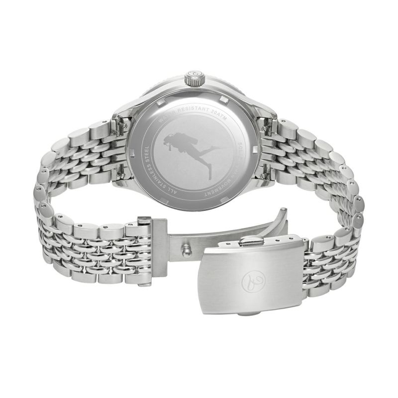 ガラスの淵から光を吸収するSUNBIRDソーラームーブメントに、200M防水のダイバーズ機能と反射防止サファイアガラスを搭載。強力な蓄光インデックスで視認性を高め、ステンレススチール316Lを使用。