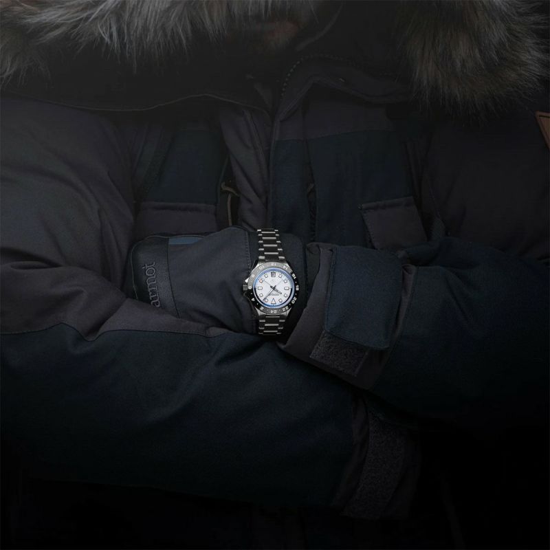 ケース素材には、無骨なロースチール(生地仕上げ)を採用。マットホワイトのダイヤルと、ハイポリッシュ仕上げのブラックDLCベゼルの組み合わせが、クラシックでありながら力強いコントラストを生み出しています。さらに、立体的に面取りされたガンメタルカラーの針とインデックスが、視認性と奥行きを両立。極限環境を想定しながらも、日常使いにも自然に溶け込むデザインに仕上げられています。