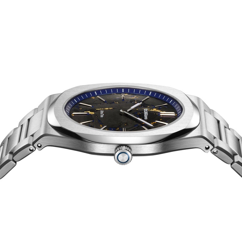 ブルーのブラスダイヤルに走るゴールドのニュアンスは、日本の伝統技法「金継ぎ」に着想を得たデザイン。欠けたものを美として蘇らせるという思想をモチーフに、ダイヤルに独特の奥行きを与えています。